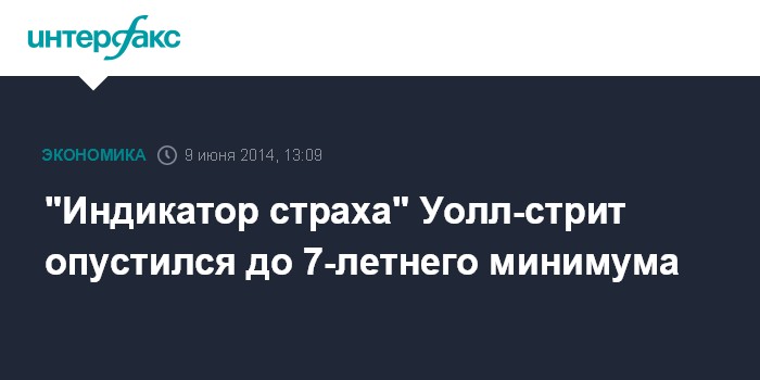 Москва. 9 июня. INTERFAX.RU - "Индикатор страха" Уолл-стрит - индекс волатильности рынка акций CBOE Vix - опустился по итогам прошлой недели ниже 11 пунктов, что соответствует минимуму с февраля 2007 года и вдвое меньше долгосрочного среднего уровня, пишет Financial Times.