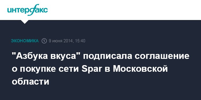 Москва. 9 июня. INTERFAX.RU - "Азбука вкуса" подписала соглашение о приобретении 100% бизнеса ЗАО "СВА-Трейдинг" и ООО "СВА-Регион", владельцев франшизы Spar в Московской области, говорится в сообщении "Азбуки Вкуса".