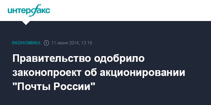 Москва. 11 июня. INTERFAX.RU - Правительство в среду одобрило проект закона "Об акционировании "Почты России", предполагающий реорганизацию "Почты" из федерального государственного унитарного предприятия в акционерное общество. Законопроект не предусматривает внесение "Почты России" в план приватизации.