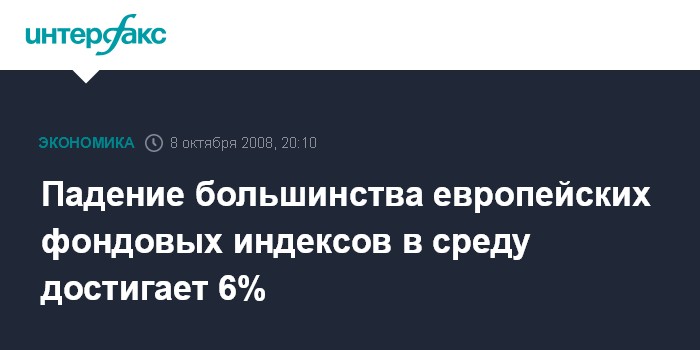 Москва. 8 октября. INTERFAX.RU - Европейские фондовые индексы падают в среду на опасениях, что скоординированное снижение процентных ставок мировыми центральными банками не сможет предотвратить глобальную рецессию. Снижение большинства индексов превышает 6%.