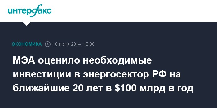 Москва. 18 июня. INTERFAX.RU - Международное энергетическое агентство (МЭА) оценивает необходимые инвестиции в энергосектор РФ на ближайшие 20 лет в $100 млрд в год.