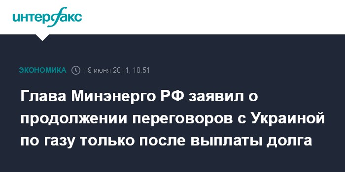 Москва. 19 июня. INTERFAX.RU - Продолжение переговоров с Украиной по газовым вопросам возможно только после погашения долгов за поставки, заявил журналистам министр энергетики РФ Александр Новак.