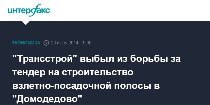 Москва. 20 июня. INTERFAX.RU - Корпорация "Трансстрой" выбыла из борьбы в тендере на строительство взлетно-посадочной полосы (ВПП) в "Домодедово", следует из материалов на сайте госзакупок.