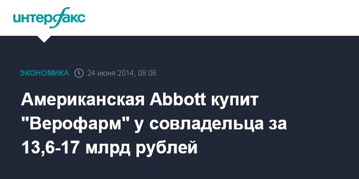 Москва. 24 июня. INTERFAX.RU - Американская фармкомпания Abbott покупает у основного совладельца ОАО "Верофарм" Романа Авдеева его долю в компании за 13,6-17 млрд рублей ($395-495 млн).