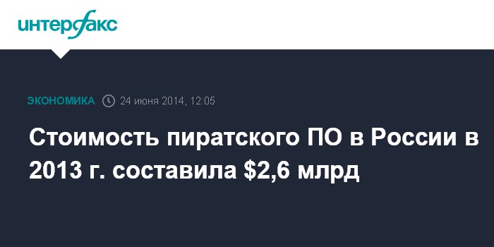 Москва. 24 июня. INTERFAX.RU - Коммерческая стоимость пиратского программного обеспечения, установленного на компьютерах российских пользователей, составила по итогам 2013 года 87 млрд рублей ($2,6 млрд), заявил менеджер программы в России BSA в России Алексей Черный.