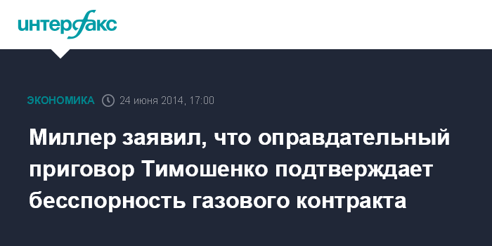 ММосква. 24 июня. INTERFAX.RU - Глава "Газпрома" Алексей Миллер считает, что решение Верховного суда Украины, оправдавшего Юлию Тимошенко, подтверждает бесспорность российско-украинского газового контракта на 2009-2019 гг.