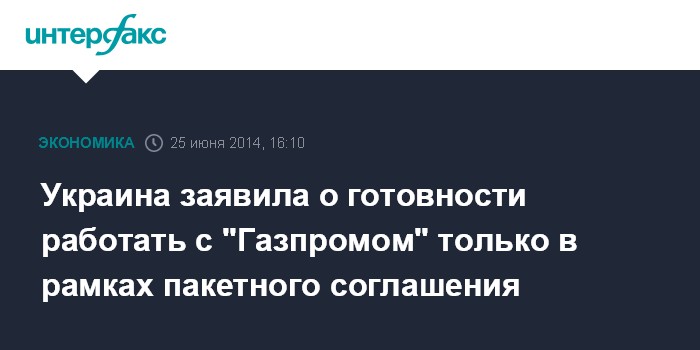 Москва. 25 июня. INTERFAX.RU - Министр энергетики и угольной промышленности Украины Юрий Продан заявляет о готовности Киева заключить с "Газпромом" пакетное соглашение по газу и продолжать работать только в рамках этого соглашения.