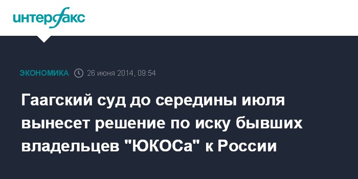 Москва. 26 июня. INTERFAX.RU - Гаагский суд до середины июля вынесет решение по иску структур Group Menatep Limited (GML), владевших контрольным пакетом в "ЮКОСе", к России, пишет Financial Times.