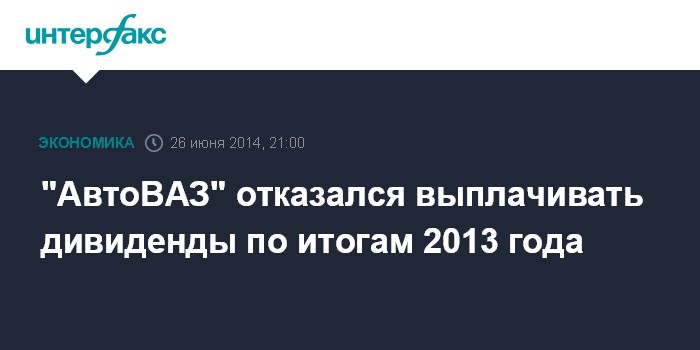 Москва. 26 июня. INTERFAX.RU - Акционеры ОАО "АвтоВАЗ" на годовом собрании в четверг поддержали рекомендацию совета директоров не выплачивать дивиденды по итогам работы в 2013 году, сообщил "Интерфаксу" представитель компании.