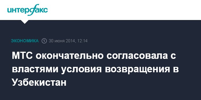 Москва. 30 июня. INTERFAX.RU - Российская компания "МТС" окончательно согласовала с властями Узбекистана условия возобновления работы в республике, сообщил "Интерфаксу" источник в правительственных кругах. Ожидается, что российская компания возобновит работу в стране до конца этого года.