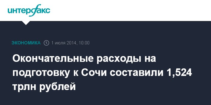 Почти все объекты к концу 2013 года были готовы на 100 или 95%, и приведенные в отчете расходы на их строительство можно считать окончательными, отмечает издание. Фактические расходы соответствуют прогнозам, которые ранее давали чиновники, оценивая подготовку к Сочи в 1,5 трлн рублей.