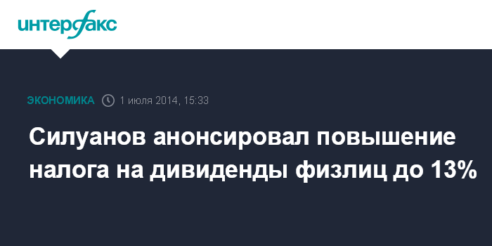 Москва. 1 июля. INTERFAX.RU - Министерство финансов РФ планирует увеличить ставку налога на дивиденды для физических лиц с 9% до 13%, заявил глава ведомства Антон Силуанов журналистам во вторник во Владикавказе.