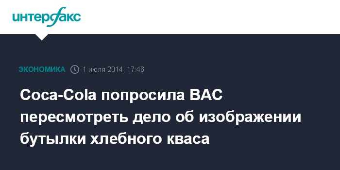 Москва. 1 июля. INTERFAX.RU - Американская Coca-Cola Company подала в Высший арбитражный суд России заявление о пересмотре в порядке надзора дела об изображении бутылки, похожей на бутылку Coca – Cola. Иск был подан к индивидуальному предпринимателю Олегу Цирикидзе по поводу распространения хлебного кваса "Бочонок" в бутылках, которые воспроизводят элементы дизайна, охраняемые товарными знаками компании.