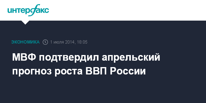 Москва. 1 июля. INTERFAX.RU - Международный валютный фонд (МВФ) ожидает роста российского ВВП в 2014 году на 0,2%, при этом сохраняются риски его пересмотра с понижением, говорится в пресс-релизе организации по итогам консультаций 2014 года с РФ в соответствии со статьей IV Устава МВФ.