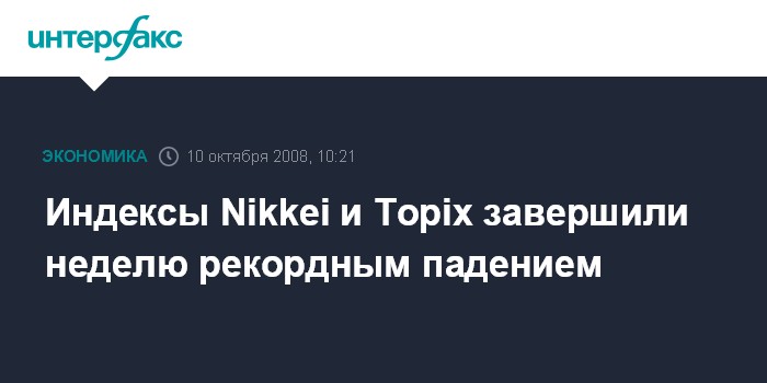 Москва. 10 октября. INTERFAX.RU - Падение японских фондовых индексов по итогам недели стало рекордным за всю историю их существования: Nikkei 225 Average потерял за неделю 20%, TOPIX - 24%, сообщило агентство Bloomberg.