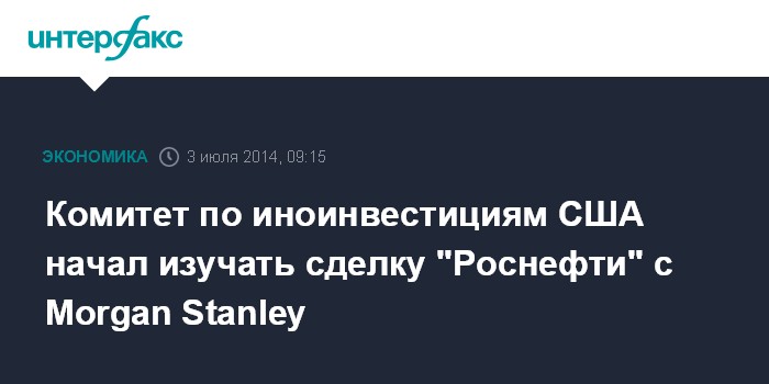Москва. 3 июля. INTERFAX.RU - "Роснефть" подала документы, касающиеся планируемой сделки по покупке трейдингового бизнеса Morgan Stanley, в Комитет по иностранным инвестициям в США (CFIUS), сообщает The Wall Street Journal со ссылкой на свои источники.