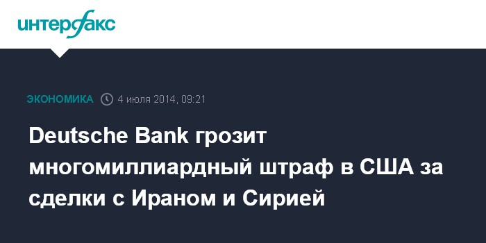 США подозревают Deutsche Bank в осуществлении сделок с такими странами, как Иран, Сирия и Судан, в обход введенных в отношении них Вашингтоном экономических санкций. Немецкий финансовый институт подтвердил получение запроса от американских властей по поводу своих долларовых транзакций и выразил намерение сотрудничать со следствием. Если подозрения подтвердятся, Deutsche Bank может грозить огромный штраф.