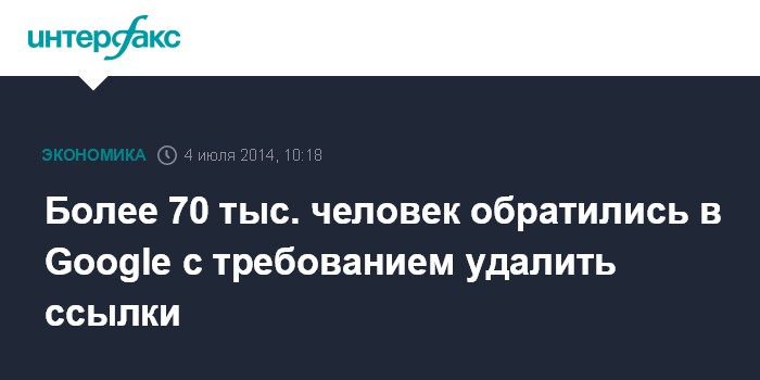 Москва. 4 июля. INTERFAX.RU - Более 70 тыс. человек уже обратились в Google с требованием удалить ссылки, ведущие на материалы с их персональными данными, сообщает агентство France-Presse. Сразу несколько крупных европейских изданий получили от корпорации уведомление о том, что из поисковика исчезли ссылки на их материалы. Среди пострадавших оказались the Guardian, BBC и Sky News.