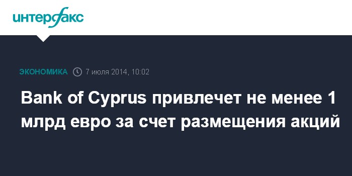 Москва. 7 июля. INTERFAX.RU - Крупнейший банк Кипра Bank of Cyprus Pcl готовится привлечь не менее 1 млрд евро за счет размещения акций среди собственных акционеров, пишет газета Financial Times. Совет директоров Bank of Cyprus заявил по итогам прошедшей в пятницу встречи, что привлечение капитала "ускорит реализацию плана реструктуризации банка" и укрепит его финансовое положение.