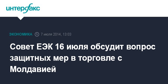 Москва. 7 июля. INTERFAX.RU - Совет Евразийской экономической комиссии (ЕЭК) на заседании 16 июля рассмотрит возможное введение защитных мер в торговых отношениях с Молдавией в связи с тем, что парламент страны ратифицировал соглашение об ассоциации с ЕЭС, сообщил первый вице-премьер РФ Игорь Шувалов на встрече премьера РФ Дмитрия Медведева с вице-премьерами в понедельник.