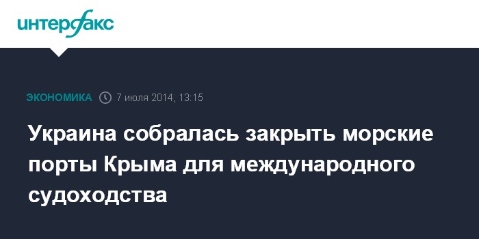 Москва. 7 июля. INTERFAX.RU - Украина закроет для международного судоходства морские порты, расположенные на территории Крым: в Евпатории, Керчи, Севастополе, Феодосии и Ялте.