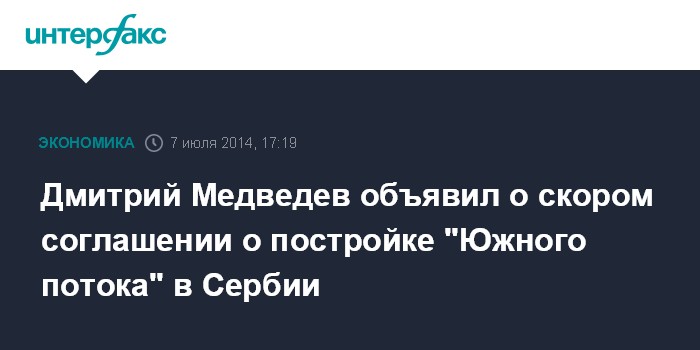Москва. 7 июля. INTERFAX.RU - Россия и Сербия в ближайшее время подпишут документ, необходимый для реализации проекта "Южный поток" на территории Сербии, сообщил премьер-министр РФ Дмитрий Медведев.