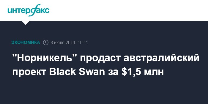 В понедельник Poseidon Nickel Limited - австралийская компания, специализирующаяся на добыче никеля и золота сообщила, что договорилась с "Норникелем" о покупке Black Swan. "Норникель" подтвердил сделку. Но цену ни продавец, ни покупатель не раскрыли. "По результатам этой сделки "Норильский никель" ожидает получить значительную прибыль, преимущественно за счет списания ранее начисленных резервов по экологическим обязательствам, которые полностью примет на себя Poseidon", - сообщил в понедельник "Норникель".