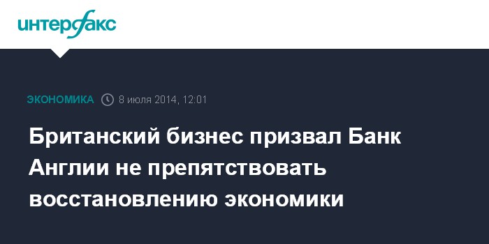 Москва. 8 июля. INTERFAX.RU - Ассоциация британских торговых палат призвала Банк Англии избежать преждевременного повышения базовой процентной ставки, чтобы не навредить восстановлению экономики Великобритании, которое продолжилось во втором квартале аналогичными темпами, что и в первом.