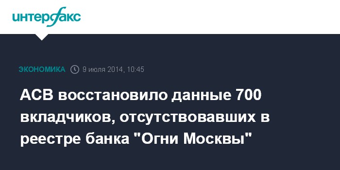 Москва. 9 июля. INTERFAX.RU - Агентство по страхованию вкладов (АСВ) включило в реестр страховых выплат банка "Огни Москвы" в совокупности 700 требований вкладчиков кредитной организации, сведения о которых отсутствовали в реестре на момент наступления страхового случая.