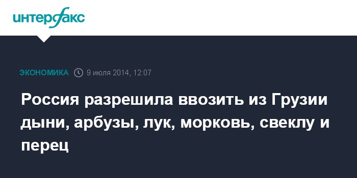 Москва. 9 июля. INTERFAX.RU - Россельхознадзор расширил список продукции растениеводства, разрешенной к ввозу из Грузии. Как сообщает служба, с 9 июля разрешены поставки репчатого лука, столовой свеклы, моркови, перца, дынь и арбузов. Это решение принято по результатам совместного отгрузочного контроля некоторых видов подкарантинной продукции, ввозимой из Грузии.