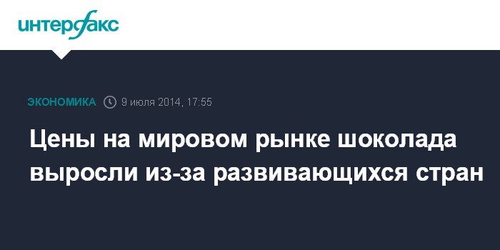 Цены на рынке какао-бобов, объем которого оценивается в $6,6 млрд, продолжают демонстрировать рост, даже несмотря на июньские прогнозы рекордного урожая в Кот-д'Ивуаре - основном производителе этого вида сырья в мире. В связи с ростом цен мировые производители шоколадных конфет вынуждены повышать цены на свою продукцию. Согласно оценкам Euromonitor, в 2014 году 1 килограмм шоколада в США подорожает в среднем на 2% - до $12,62, а подъем за последние пять лет составит 18%.