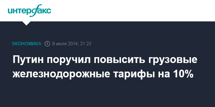 Москва. 9 июля. INTERFAX.RU - Тарифы на грузовые железнодорожные перевозки в 2015 году будут проиндексированы в размере до 10%. Поручение предусмотреть индексацию в этих пределах правительству дал президент РФ Владимир Путин. Перечень его поручений по итогам совещания с членами правительства 25 июня опубликован на сайте Кремля.