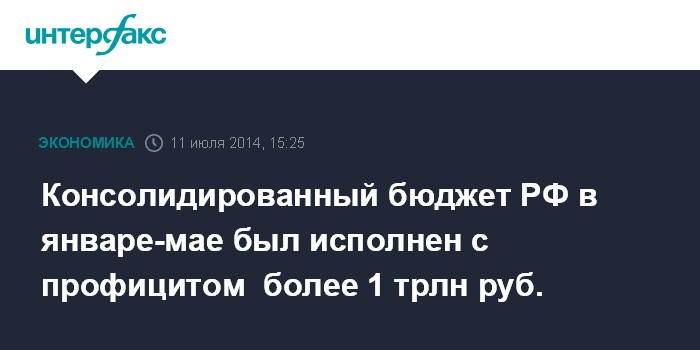 Москва. 11 июля. INTERFAX.RU - Консолидированный бюджет РФ в январе-мае 2014 года исполнен с профицитом 1 трлн 52,578 млрд рублей, сообщается в материалах, опубликованных на сайте Федерального казначейства.