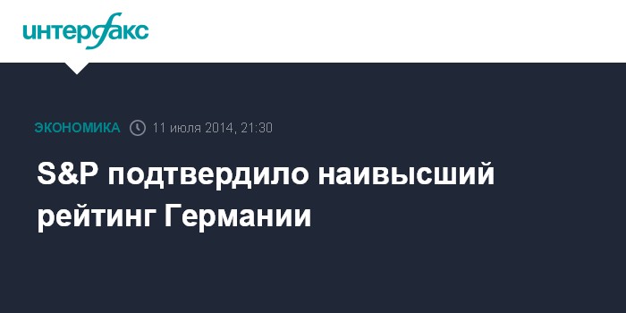 Москва. 11 июля. INTERFAX.RU - Международное рейтинговое агентство Standard & Poor's подтвердило долгосрочный кредитный рейтинг Германии на наивысшем уровне - "AAA" - со "стабильным" прогнозом, говорится в пресс-релизе агентства.