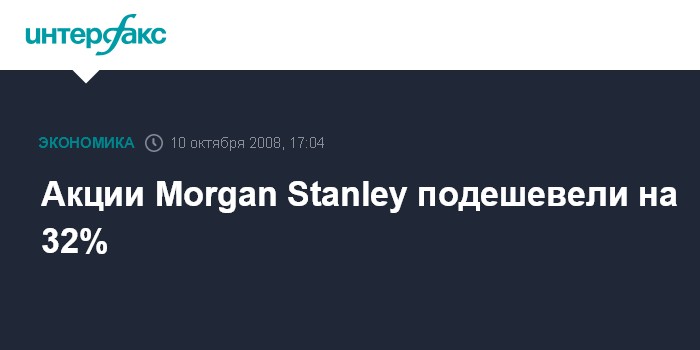 Нью-Йорк. 10 октября. INTERFAX.RU - Цена акций Morgan Stanley упала в ходе торгов в пятницу в Нью-Йорке на 32% - до $8,46, сообщает агентство Bloomberg.