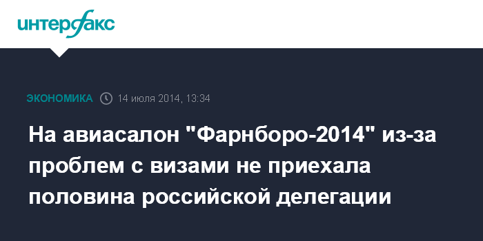 Ранее стало известно, что многие члены российской делегации, собиравшейся на "Фарнборо-2014", не получили британские визы. В частности, по данным посольства РФ, документы не смогли оформить технические сотрудники, обеспечивающие эксплуатацию экспонатов, представленных Россией. На выставку планировали поехать представители Минпромторга, Роскосмоса, Росавиации, "Ростеха", корпорации "Иркут", "Рособоронэкспорта" и других компаний. В "Рособоронэкспорте" случившееся объяснили недобросовестной конкуренцией и слабостью страны-организатора выставки.
