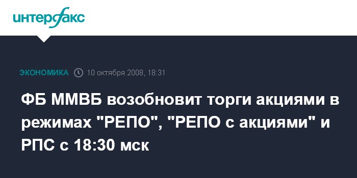 Москва. 10 октября. INTERFAX.RU - Фондовая биржа ММВБ возобновила в пятницу торги акциями в режимах "РЕПО", "РЕПО с акциями" и РПС (режим переговорных сделок) с 18:30 МСК по предписанию ФСФР России, сообщила биржа.