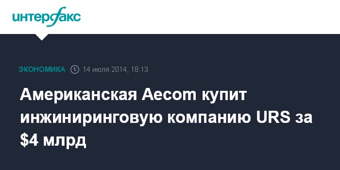 Москва. 14 июля. INTERFAX.RU - Американская Aecom Technology приобретает инжиниринговую компанию URS Corp. за $4 млрд, чтобы расширить спектр предоставляемых услуг, в том числе на нефтегазовом рынке, говорится в совместном сообщении компаний.