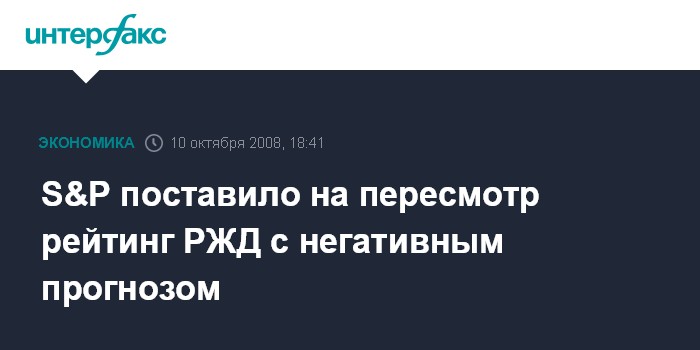 Москва. 10 октября. INTERFAX.RU - Международное рейтинговое агентство Standard & Poor‘s поставило на пересмотр с негативным прогнозом рейтинг "ВВВ+" ОАО "Российские железные дороги", говорится в пресс-релизе агентства.