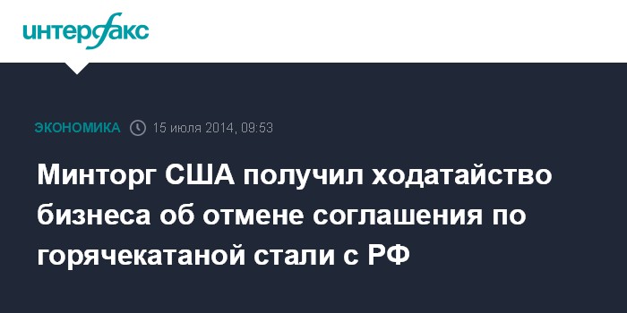 Москва. 15 июля. INTERFAX.RU - Министерство торговли США изучает ходатайство американских металлургических компаний, которые предложили отменить соглашение по импорту горячекатаной стали из РФ, сообщил представитель ведомства агентству Bloomberg. По его словам, крайний срок рассмотрения не установлен.