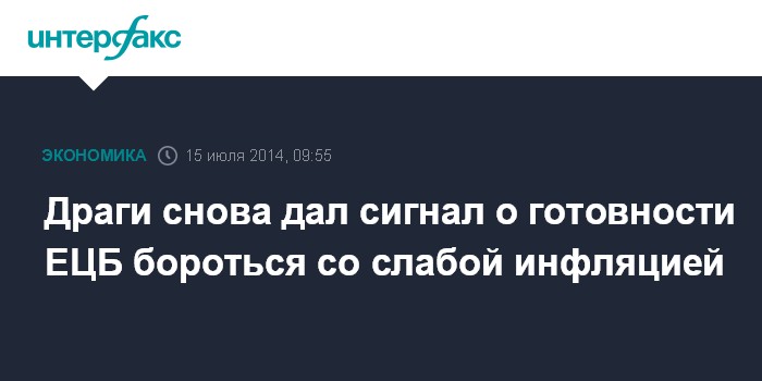 Москва. 15 июля. INTERFAX.RU - Глава Европейского центрального банка Марио Драги в очередной раз дал сигнал о готовности ЕЦБ к дополнительным решительным мерам, включая "количественное смягчение" (QE), если они потребуется для борьбы с затяжной слабостью инфляции в еврозоне, пишет The Wall Street Journal.
