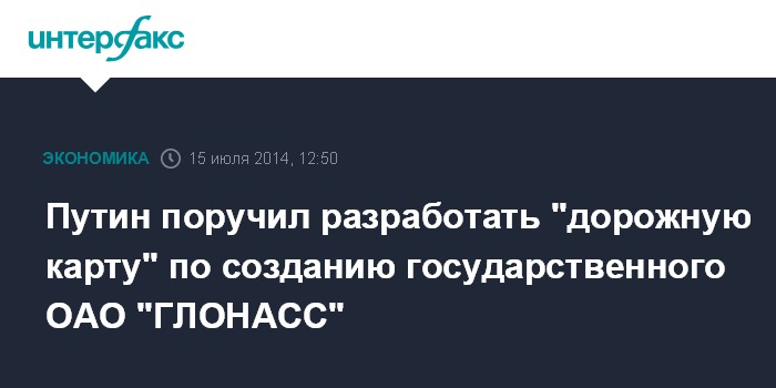 Москва. 15 июля. INTERFAX.RU – Президент России Владимир Путин поручил правительству разработать и утвердить "дорожную карту" по созданию ОАО "ГЛОНАСС" со 100-процентным госучастием. Соответствующее поручение главы государства опубликовано на сайте Кремля.