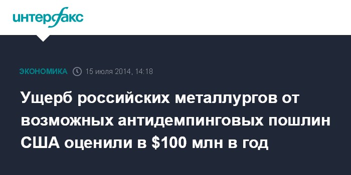 Москва. 15 июля. INTERFAX.RU - Возможный ущерб металлургической отрасли от отмены соглашения по импорту горячекатаной стали из России в США составит минимум $100 млн в год, заявила "Интерфаксу" помощник министра экономического развития РФ Елена Лашкина.