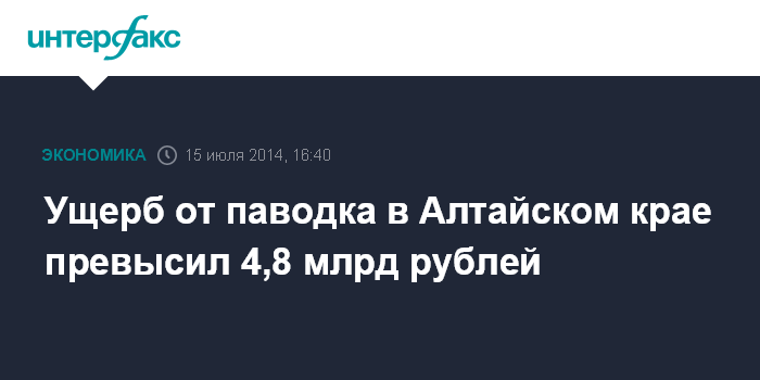 Москва. 15 июля. INTERFAX.RU - Ущерб, нанесенный паводком в Алтайском крае, составил, по уточненным данным, 4 млрд 856 млн рублей, сообщил заместитель губернатора региона Яков Ишутин на заседании оперативного штаба во вторник .