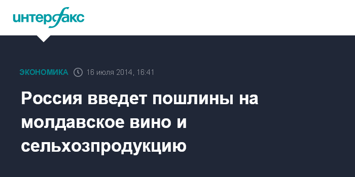Москва. 16 июля. INTERFAX.RU - Россия намерена в одностороннем порядке ввести пошлины на молдавское вино и сельхозпродукцию, следует из проекта постановления правительства РФ, подготовленного Минэкономразвития. Документ опубликован в среду на едином портале для размещения проектов нормативных актов.