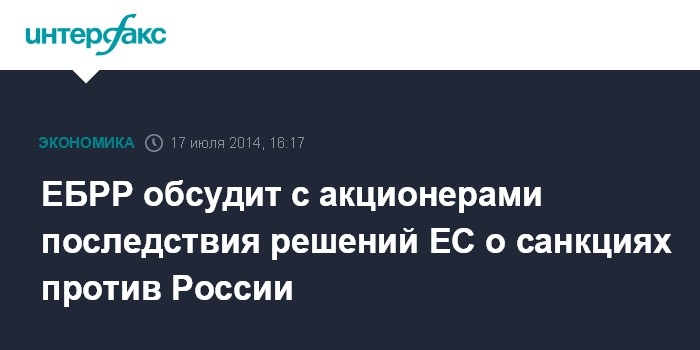Москва. 17 июля. INTERFAX.RU - Европейский банк реконструкции и развития (ЕБРР) обсудит со своими акционерами поручение Европейского Союза (ЕС) приостановить проекты банка в России в рамках очередной волны международных санкций, сообщили "Интерфаксу" в ЕБРР.