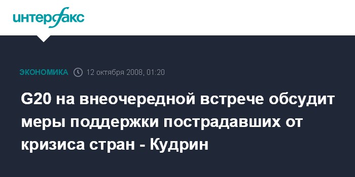 Вашингтон. 12 октября. ИНТЕРФАКС-АФИ - Министры финансов стран "группы двадцати" (G20) на внеочередной встрече в Вашингтоне обсудит дополнительные меры поддержки стран, которые пострадали от финансового кризиса, сообщил журналистам вице-премьер министр финансов РФ Алексей Кудрин.