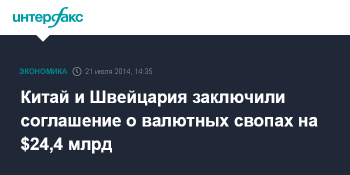 Москва. 21 июля. INTERFAX.RU - Центральные банки Китая и Швейцарии заключили двустороннее соглашение о валютных свопах на сумму 150 млрд юаней или 21 млрд швейцарских франков ($24,4 млрд), сообщило китайское государственное информационное агентство Синьхуа со ссылкой на информацию Народного банка Китая (НБК).