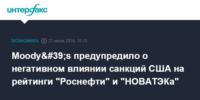 Москва. 21 июля. INTERFAX.RU - Расширенные санкции США против России, коснувшиеся нефтегазовых компаний "Роснефть" и "НОВАТЭК", ограничат их доступ к финансированию от американских финкомпаний и окажут негативное влияние на их кредитные показатели, особенно если сроки действия санкций затянутся, говорится в обзоре рейтингового агентства Moody's Investors Service.