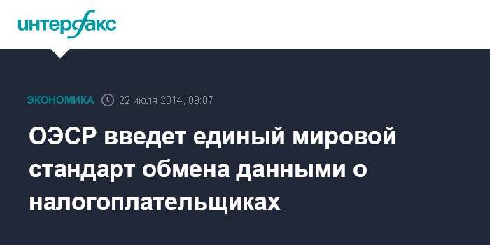 Москва. 22 июля. INTERFAX.RU - Организация экономического сотрудничества и развития (ОЭСР) сделала в понедельник еще один шаг к созданию трансграничной системы обмена информацией о налогоплательщиках, опубликовав полную версию единых международных стандартов такого обмена.